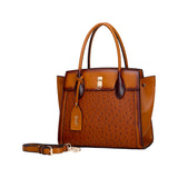 Elevate your everyday look with this Brangio Italy designer handbag, where timeless structure meets luxe texture. Crafted from premium faux leather and finished with a rich ostrich-embossed front panel, this piece blends elegance with edge. Warm neutral tones, contrasted with deep chocolate trim and a chic gold-tone lock, create a handbag that’s both fashion-forward and endlessly versatile.