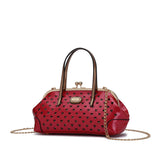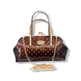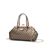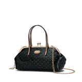 Boldly nostalgic and beautifully modern — the Brangio Italy Starz Art Retro Handbag brings vintage elegance into the now. Cloaked in metallic rose gold vegan leather with high-gloss heart studs, this sculptural satchel features a charming retro kiss-lock closure, polished top handles, and a gold-tone chain strap for shoulder or crossbody wear.