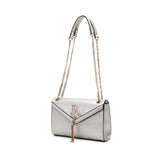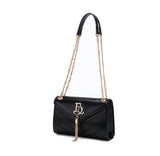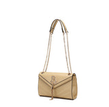 Make a bold statement with this stunning shoulder bag, designed to combine modern elegance with timeless sophistication. Featuring a sleek envelope design with embossed details and a polished gold emblem, this bag is the perfect accessory for any occasion. The dual gold chain straps add a touch of luxury and versatility, allowing you to carry it comfortably on your shoulder or as a crossbody. Its compact yet functional interior offers ample space to keep your essentials organized, making it an ideal choice for both day and night outings.