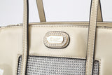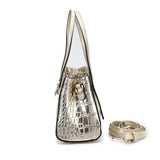 Elevate your style with this sophisticated glossy handbag, designed for the modern woman. Featuring a sleek metallic finish and a touch of shimmer, this bag combines elegance and practicality. Its spacious interior is perfect for organizing your essentials, while the sturdy double handles ensure comfortable carrying. Accented with a decorative emblem and intricate detailing, this handbag is the ultimate accessory for both casual outings and formal occasions.