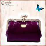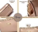 Step into the spotlight with the Brangio Italy Golden Elegance Clutch — a dazzling companion designed to turn heads. Wrapped in radiant rose gold satin-finish faux leather, this refined evening bag features delicate crystal-encrusted floral accents and a luxurious oversized pearl kiss-lock closure for vintage charm.