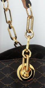 - Gold-tone chain-link handles with tan leather shoulder rests for comfort