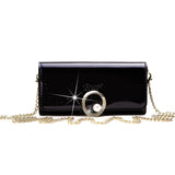 Introducing the Brangio Sleek Evening Clutch, a true masterpiece in contemporary fashion. Crafted from glossy patent leather, this clutch exudes sophistication with its chic, minimalist design. The intricate gold-tone circular clasp, featuring a lustrous pearl accent, adds a luxurious touch. With a detachable chain strap, this bag offers versatility, allowing you to wear it as a shoulder bag or carry it as a stylish clutch. Ideal for any formal event, night out, or cocktail party, this clutch is the perfect accessory to elevate your evening look with ease and elegance.