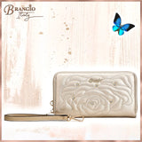 Where elegance meets everyday ease — the Brangio Italy rose-quilted wristlet wallet is the perfect companion for modern luxury on the move. Crafted from radiant gold faux leather and adorned with a sculpted floral pattern and sparkling rhinestones, this piece delivers glamor in the palm of your hand.