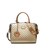 Add a pop of sophistication to your look with this glossy handbag, designed to stand out. Featuring a vibrant finish with delicate studded detailing, this bag is as elegant as it is practical. The dual-tone handles add a stylish contrast, while the attached floral charm provides a playful yet chic touch. With a spacious interior and durable construction, this handbag is perfect for both casual outings and formal events, making it a versatile addition to your collection.