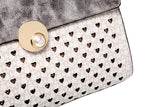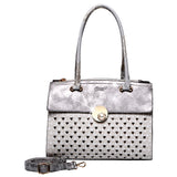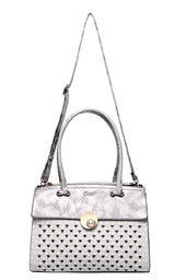 Add a touch of charm to your daily ensemble with the Silver Elegance Heart Tote. Designed to impress with its delicate heart cut-out details and shimmering silver finish, this tote is perfect for both casual and formal occasions.